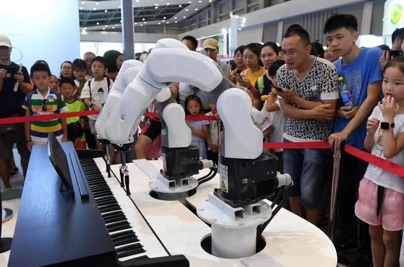 机械臂乐队”在智博会上演奏钢琴曲。