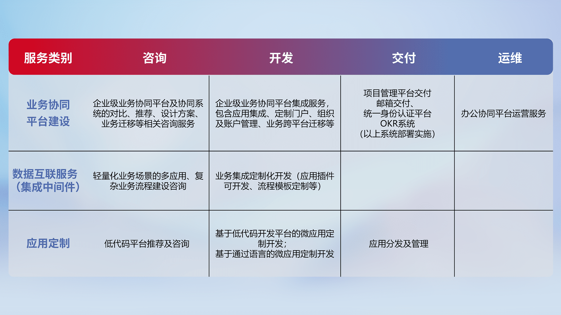 针对钉钉、、、企微、、IDaas等平台级产品提供产品的规划、、方案、、、、交付、、定制化开发等服务,,,,实现如统一协同办公、、、、智能客户服务、、、、混合会议管理、、智能数据查询、、、、等业务场景,,,,实现数字化转型。。