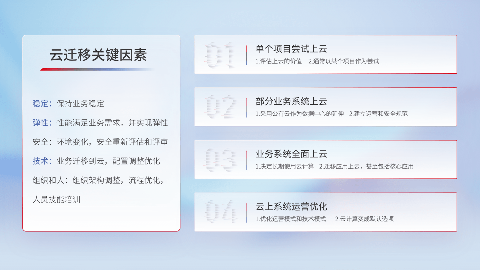 结合实际业务,,,从规划设计、、云平台选型、、、云原生改造、、、、数据迁移、、、、集成交付,,,,迁移全过程为客户识别最佳上云路径,,,做好风险识别管理,,,,设计网络架构、、身份权限、、安全审计合规、、操作审计、、、、日志审计、、、、监控告警策略、、、、多站点容灾设计等,,,对云上基础设施进行整体规划,,,提升IT治理水平,,,,以满足弹性、、、、高可用、、、高性能的需求。。。。