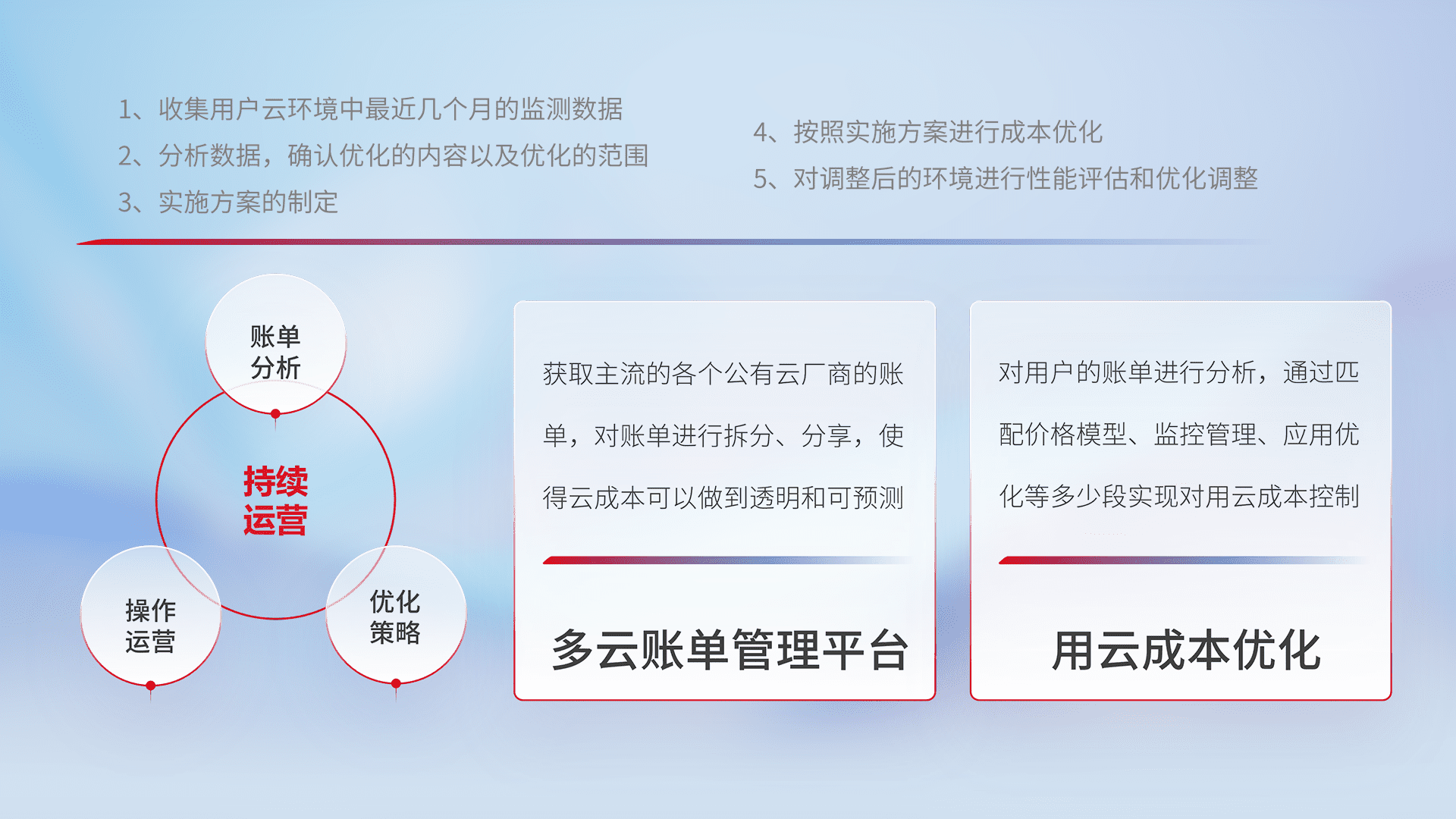 通过多云纳管,,,以统一的资源数据模型把客户的云资源进行抽象和封装,,进而实现对多云资源的统一操作,,,保障云资源管理的可靠性、、、、稳定性与可用性。。。量身定制化运维内容,,,配置、、、、开发运维、、、补丁管理、、、备份、、、监控、、、认证和访问管理、、、、审计和日常巡检等,,,保障在用云过程中的可靠度,,稳定度以及高可用率。。。