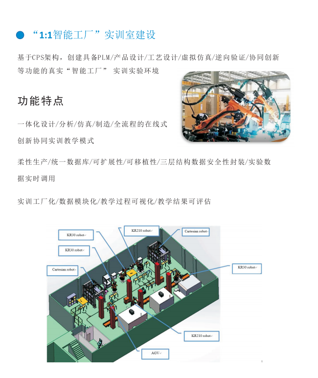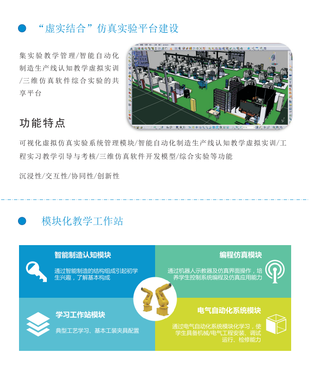 针对智能制造教育,为高等院校/中职院校全力打造智能制造创新教学体系建设(专业建设/师资培养/教学管理服务/资格证书认定/协同创新教学环境搭建);提供“1:1智能工厂”实验室/“虚实结合”仿真实验平台/数字资源及现代应用技术实验室建设,实现从虚拟到现实的智能制造实训教学平台。